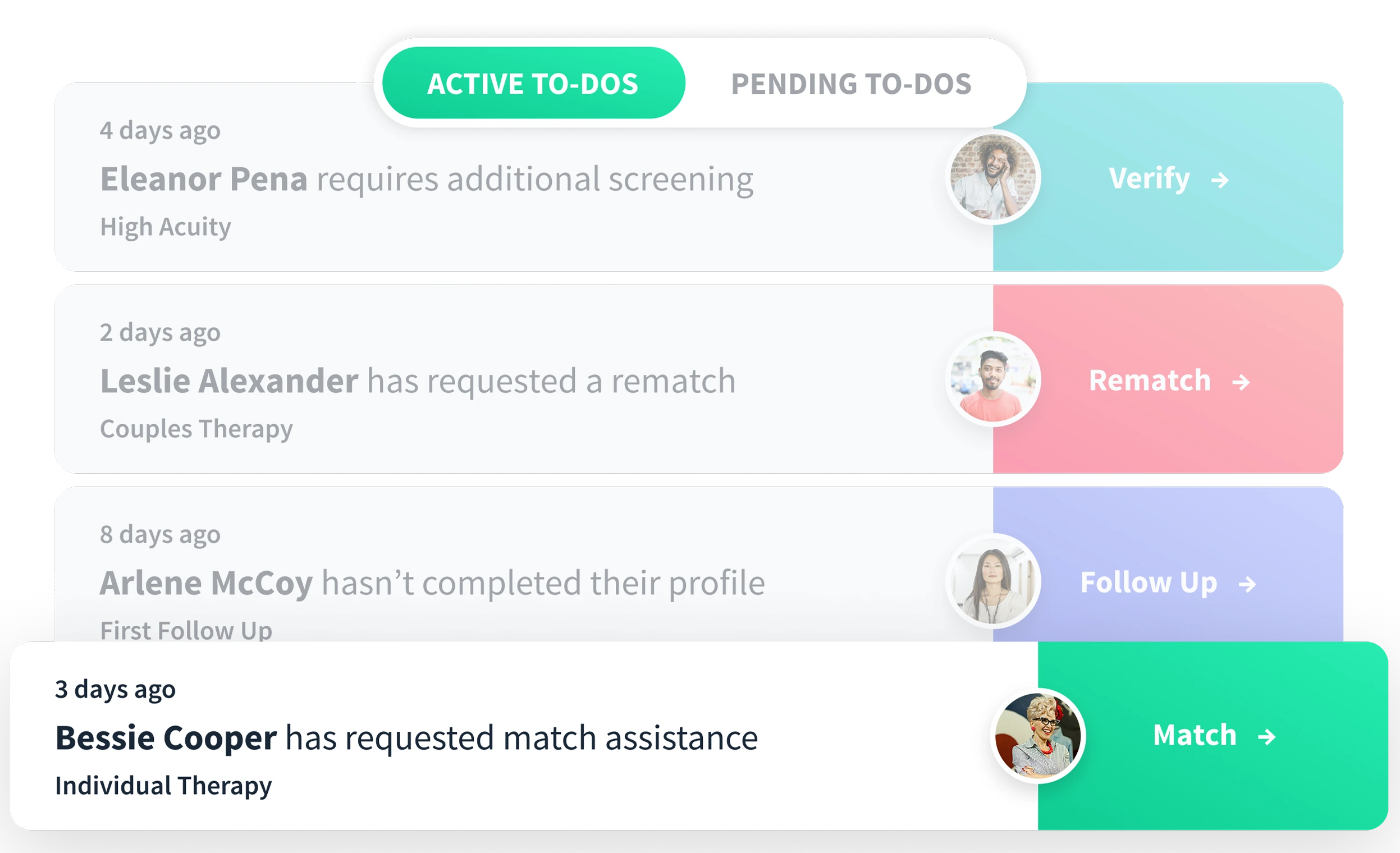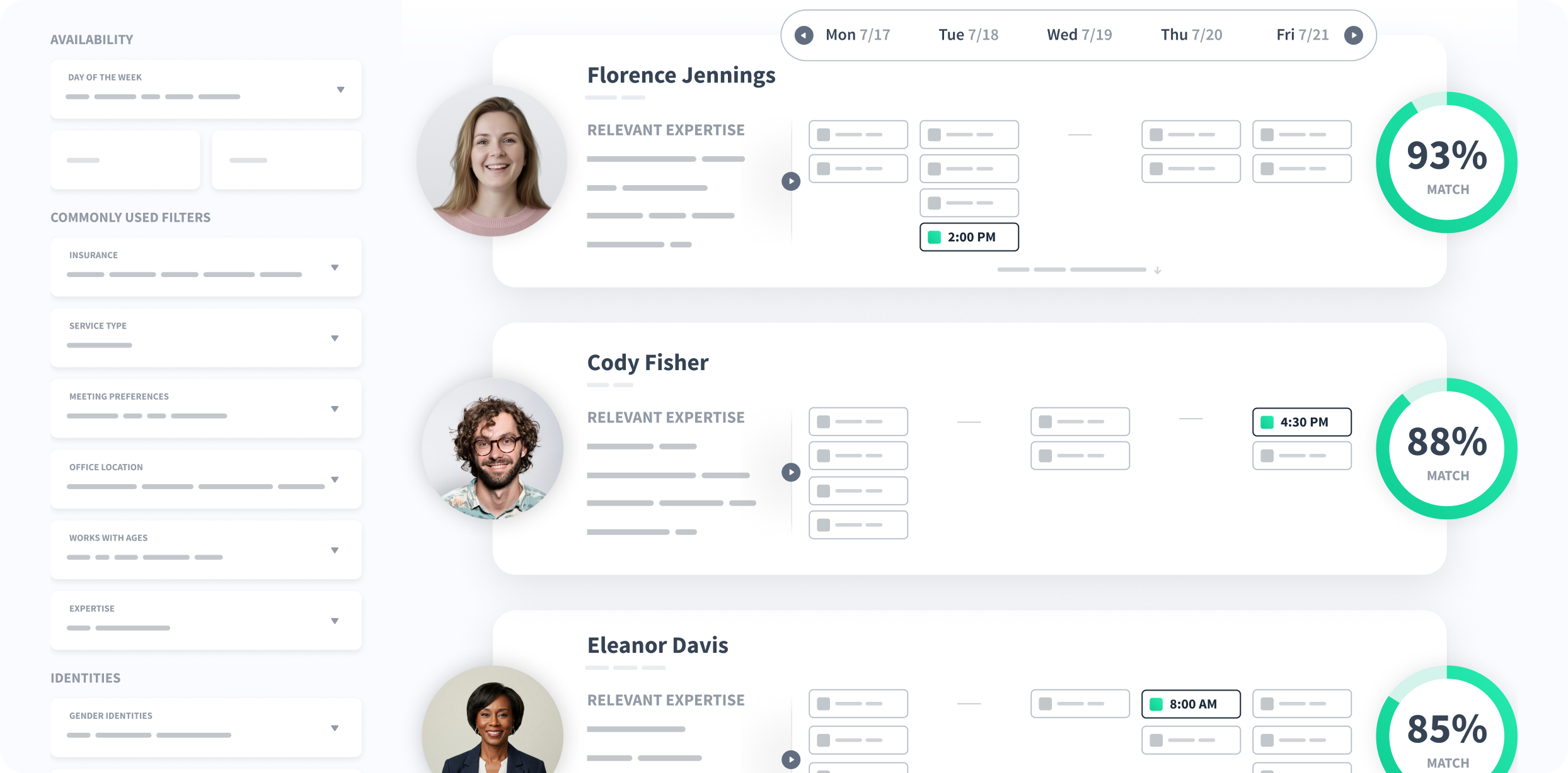 Our platform connects patients with providers who are a perfect match for their needs and personalities—creating stronger bonds, better outcomes, and higher satisfaction on both sides. Patients feel seen and supported. Clinicians work with the kinds of patients they serve best, setting everyone up for success.